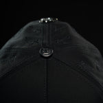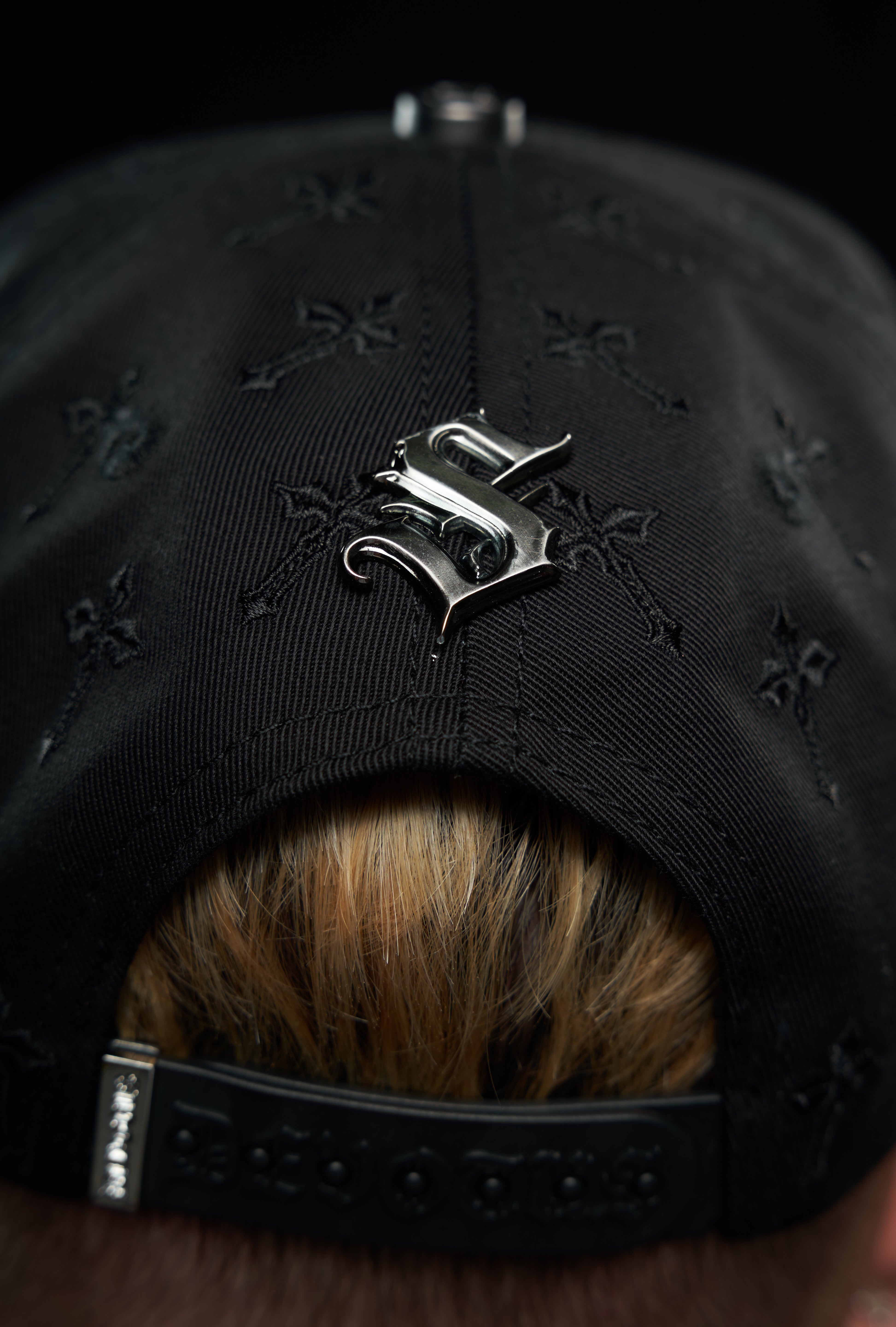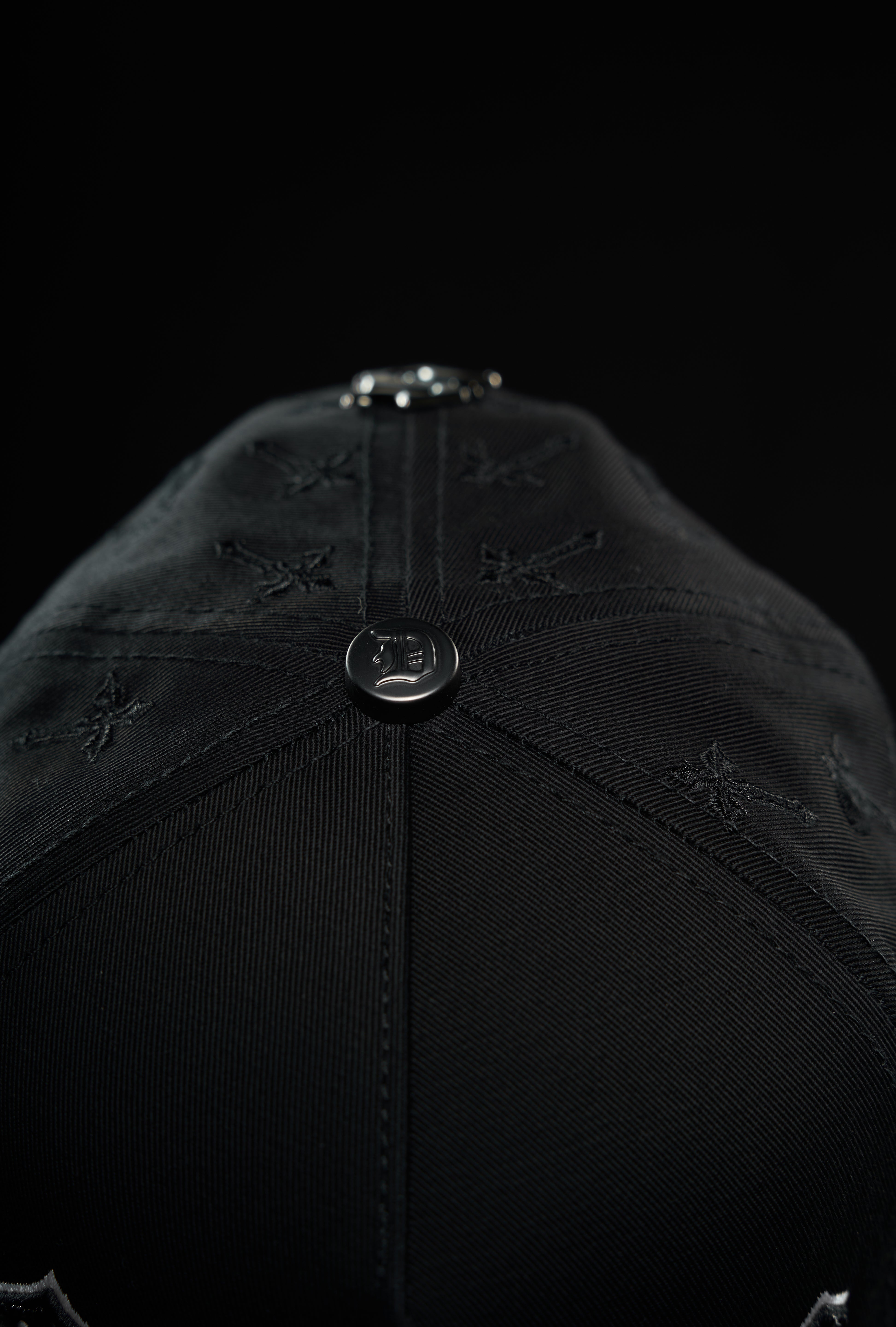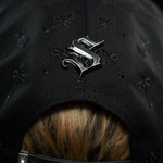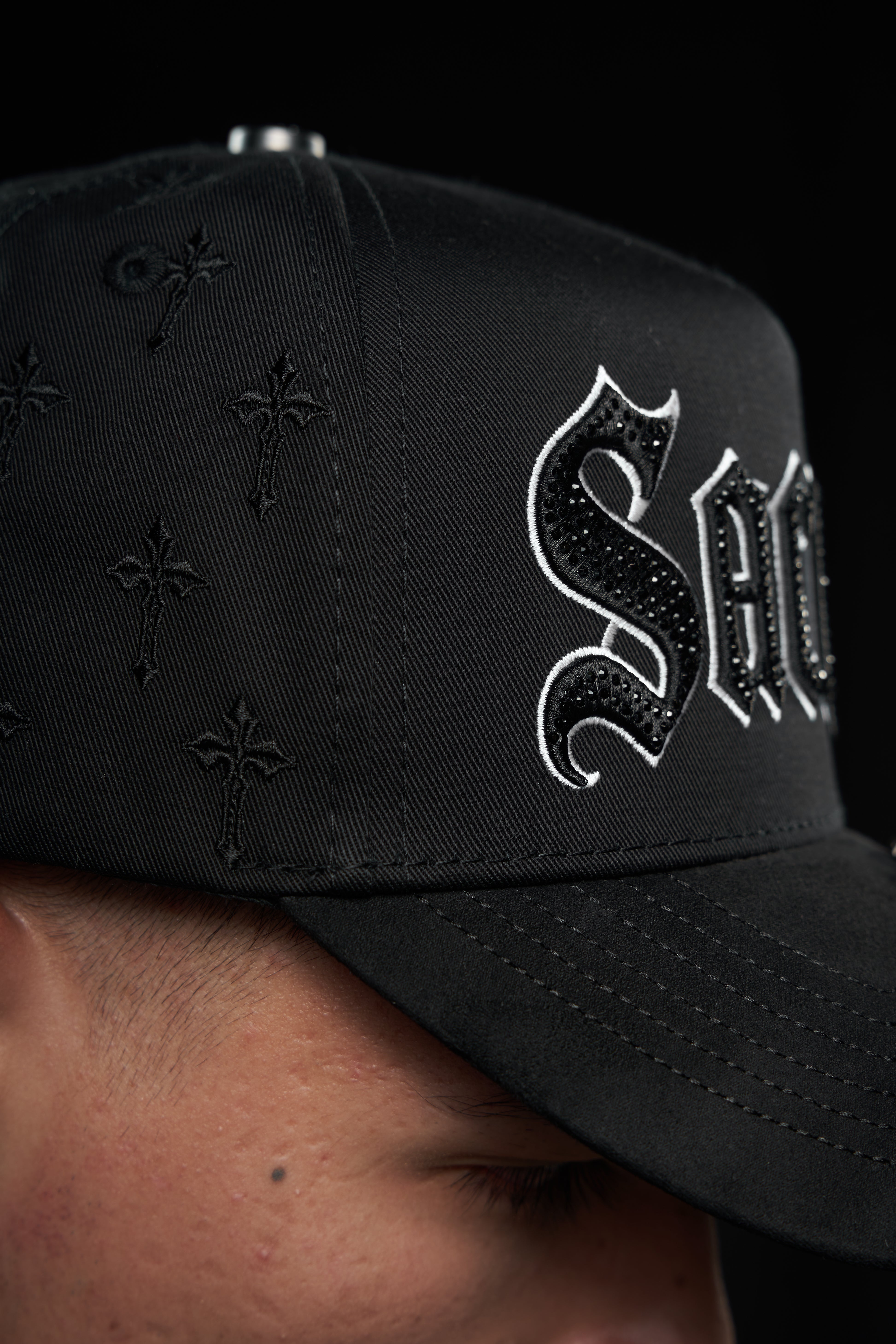 Gorra en drill y terciopelo, con apliques metálicos,en pedrería y bordados. Marca devotus